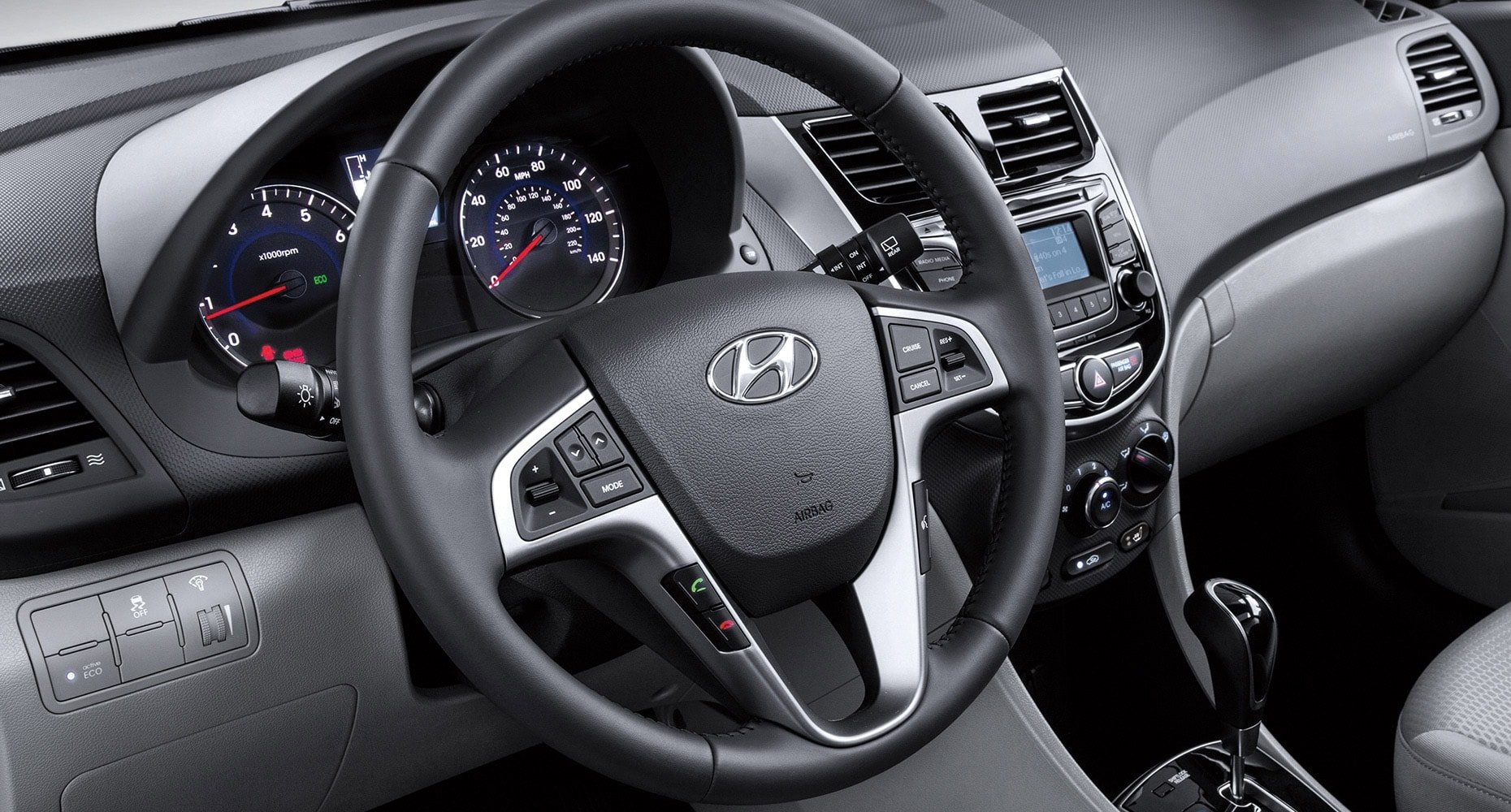 | The 2017 Accent has a spot for almost anything you decide to travel with. Available features include overhead sunglasses storage, front map pockets with bottle holders, a storage tray, dual front cupholders, a sliding armrest storage console, and a front glove compartment - all to keep you organized. And if you need to store larger or longer items, it also offers an available 60/40 split fold-down rear seatback. | Expect more from your steering wheel. The available steering wheel-mounted controls let you navigate personal playlists, change the station, and turn up the volume on the go. |
